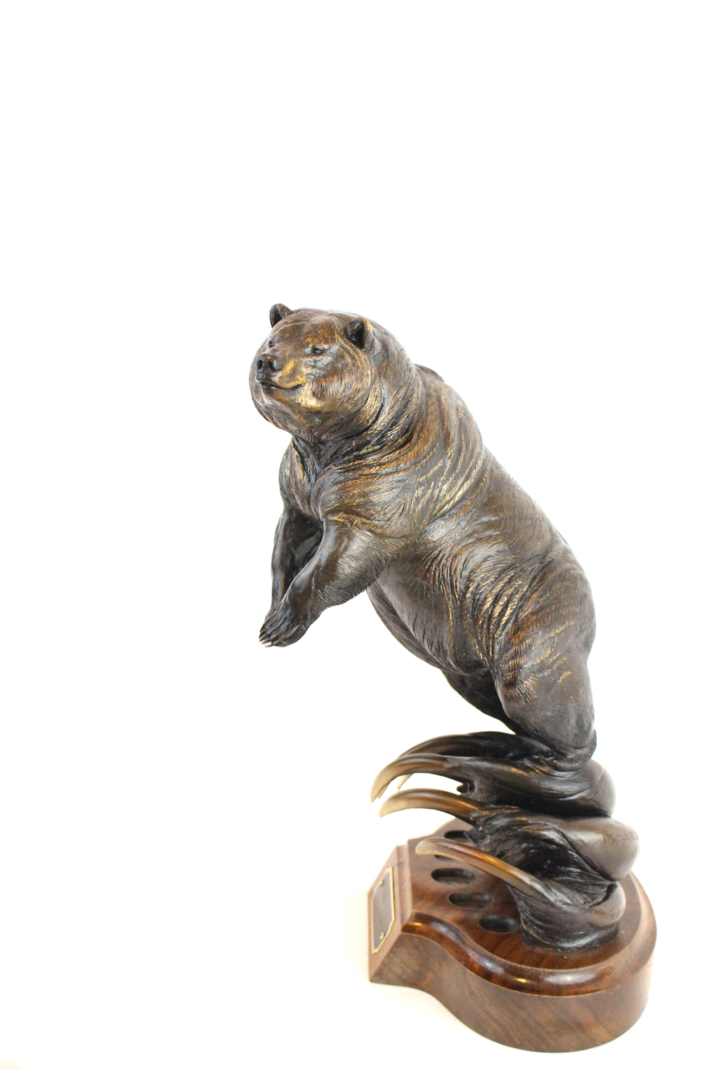 The idea for this piece came from a life threatening experience I encountered in the early 70’s during a late September caribou hunt. I found myself in a predicament. In regard to bears, I hadn’t learned the full meaning of respect until I had a fully mature grizzly standing a stone throw’s distance from me, intensely swaying it’s head from side to side, loudly whoofing, and violently popping it’s teeth ….. all signs of a forth coming charge. I was in the hot seat. That bear wanted me out of it’s territory! The provoked grizzly, standing fully erect on it’s hind legs, suddenly thrust it’s powerful forearms forward, dropped down to all fours, and, in a heartbeat, charged so close I had only time for one shot from the hip. Fortunately for me, the bullet split the skull (inches from a complete miss) sending the attacking bear tumbling head over heals, spraying blueberry poop high into the air splattering me as I ducked sideways. My entire body shook & trembled involuntarily for sometime after the incident. I have a much deeper respect for these critters since that time. To this day, that intense encounter remains vivid in my mind. This bronze depicts that moment of confrontation. The grizzly’s decision to rid it’s territory of intruders displays the forearms high and the body leaning forward, about to drop down on all fours for the full charge. This lends the title, “Trouble’s a Bruin.” I decided to incorporate a real set of grizzly claws into the base. I felt this would help convey the strength, power, and the ultimate respect these awesome creatures deserve.