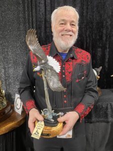 Together Frank & Sue worked the winter of 2022-23 everyday, putting in long hours bringing the life-size bronze eagle entitled “Pursuit” to fruition. Since then the couple decided to do a much smaller rendition. They had a 3-D scan for the foundry to produce the smaller version. Once one was printed, Frank worked it over for the foundry to start the mold process and pour the smaller version which was completed January 2025. Tuuid/Pursuit is done in a 36 edition 21″T x 11″ W x 9”D.